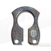The Blade: The Persian-style is hollow ground to an upswept slicer with diagonal jimping on the thumb rest. The pattern of this extremely unique Damascus is very reptilian and bounces off different colors depending on the light. The scale-pattern appears almost holographic at times. Super cool stuff. It opens smoothly via a single Silver thumb stud and locks up solid when open. Aaron’s logo appears on the front flat beneath the thumb stud.