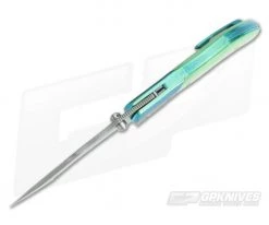 The custom Curvo folder made by Alan Folts is a wild and curvaceous design with striking visual appeal in both the shape and materials. This piece is Alan’s “Standard” version with two-tone CPM-154 stainless steel blade, Florentine textured and anodized bolsters, clip and backspacer and Glow-in-the-Dark Kirinite acrylic handle scales. The impressive Curvo is sure to make a statement where ever it goes.