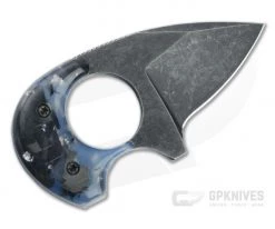 The elusive Baby Bear from Alan Folts is back and as good as ever. This ultra-compact ring knife makes a perfect every day carry fixed blade and excels in both utility and defensive tasks. This version comes with a “blackwash” finished CPM-154 blade, Kipps Custom Flake Blue Glow Carbon Acrylic scales, and custom leather belt sheath.