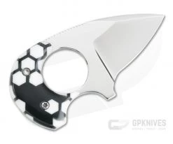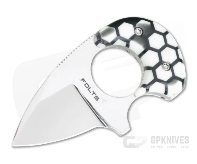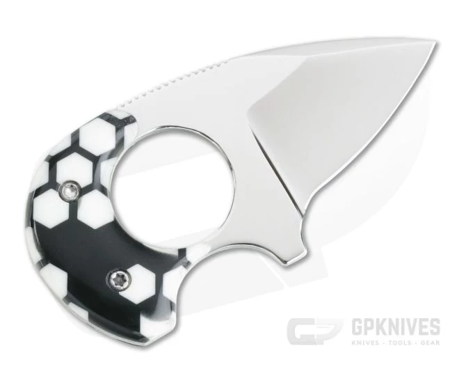 The elusive Baby Bear from Alan Folts is back and as good as ever. This ultra compact ring knife makes a perfect every day carry fixed blade and excels in both utility and defensive tasks. This version comes with a polished CPM-154 blade and black and white Voodoo Resin Acrylic handles along with a custom leather belt sheath.