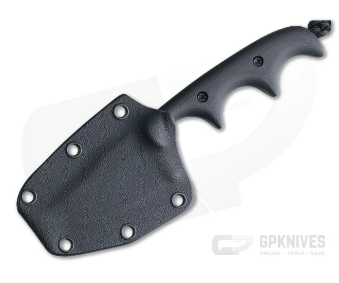 Handle: Three deep finger grooves and attached lanyard create a secure and ergonomic grip. The addition of the lanyard extends the 3-finger grip to fill most hands. Blasted and contoured Black G10 handle scales are attached via Torx screw hardware and provide a secure, high traction grip rounding out the stealth aesthetic of this piece.