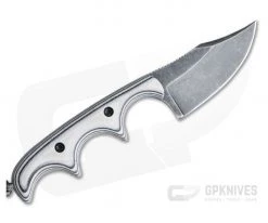 Alan Folts Custom Minimalist Bowie is a small everyday carry fixed blade made to be minimal in size (hence the name) while offering maximum function. The lightweight, well-balanced design doesn’t take up much space making it a perfect choice for discreet every day carry. This version comes with a Black Washed (coated and tumbled), CPM-154 Bowie blade and Black & White layered G10 handles.