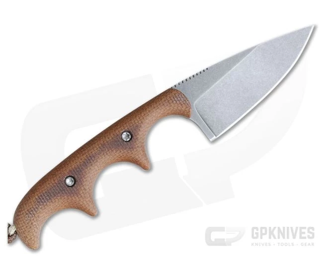 Handle:Â Three deep finger grooves and attached lanyard create a secure and ergonomic grip. The addition of the lanyard extends the 3-finger grip to fill most hands. Matte finished natural Micarta handle scales are attached via Torx screw hardware.