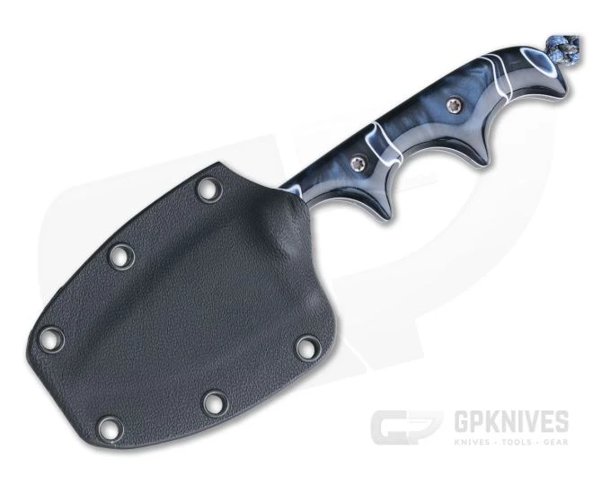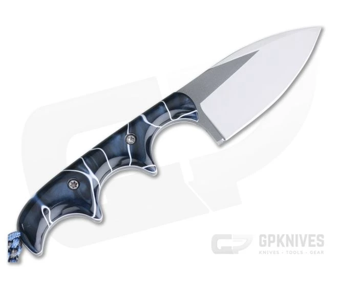 Alan Folts Custom Minimalist Spear Point is a small everyday carry fixed blade made to be minimal in size (hence the name) while offering maximum function. The lightweight, well-balanced design doesn’t take up much space making it a perfect choice for discreet every day carry. This version comes with smooth, polished Pearl Blue Kirinite acrylic handles and a two-tone Polished CPM-154 blade.