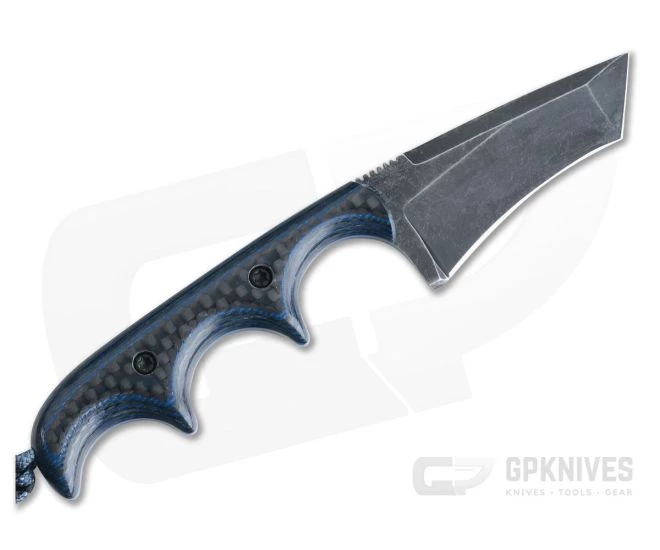 Alan Folts Custom Minimalist Tanto is a small everyday carry fixed blade made to be minimal in size (hence the name) while offering maximum function. The lightweight, well-balanced design doesn’t take up much space making it a perfect choice for discreet every day carry. This version comes with a black washed, CPM-154 Tanto blade and Carbon Fiber/Blue G10 Hybrid handles.