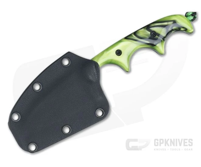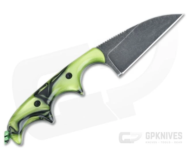 Alan Folts Custom Minimalist Wharncliffe is a small everyday carry fixed blade made to be minimal in size (hence the name) while offering maximum function. The lightweight, well-balanced design doesn’t take up much space making it a perfect choice for discreet every day carry. This version comes with Toxic Green Kirinite Acrylic handles over black liners and a Black Washed CPM-154 blade.
