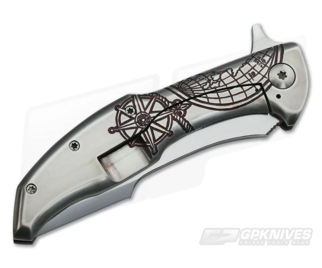 The Handle: Both slabs of Ti are hand carved and anodized by the man himself. The front featuring more of the sea scene of a boat under attack by a creature from the depths below. Waves created by the beast show the turmoil the crew must be going thru along with its large tentacle wrapped around the boat’s anchor. Alan even added a few small fish near the bottom to top it off. The reverse portrays a partial atlas and other sailing symbols meant for the open sea. All of this titanium has a brush/polished appearance while the entire carving was anodized to a dark purple coloration. Full Ti hardware on this piece with matching back strap