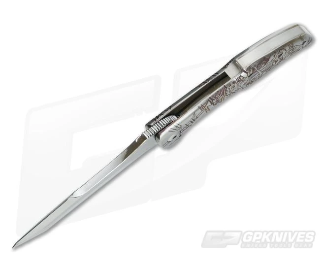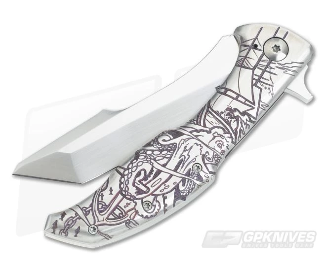 Owning a custom knife hand carved by maker Alan Folts is a bit like owning some buried treasure. This scene is fitting, known as the Kraken Heiro, hand carved and anodized nautical theme on the front of back of the titanium handle. It’s a 1 off you’re certainly going to want in your collection.