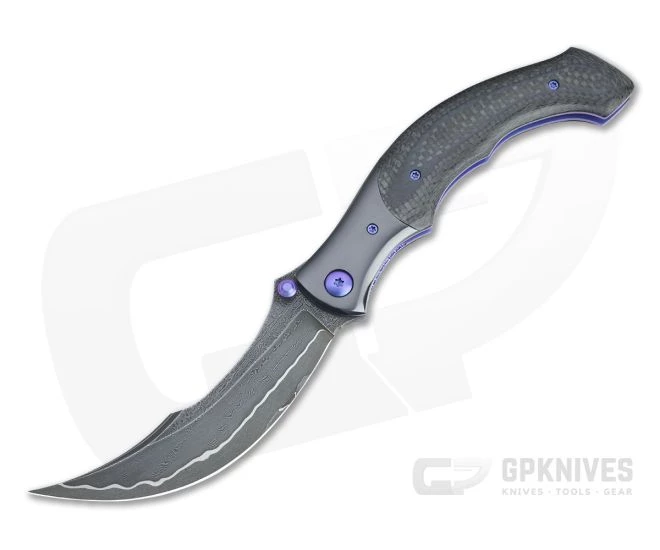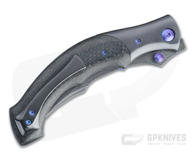 Handle: Thick violet anodized titanium liners support contoured and polished carbon fiber scales handle scales and flush fit zirconium bolsters with matching partial back spacer. The striking material and serpentine curves of the handle are eye catching and deliver a surprisingly comfortable handle made secure with subtle and well-placed finger grooves and a snakes head pommel that lock the knife in a solid grip, forward or reverse. An anodized custom pivot and titanium Torx screws complete the construction.