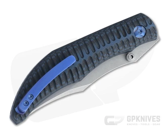 Handle: Thick blue anodized titanium liners support fully contoured blue/black G10 handle scales that are milled with a deep texture for optimal traction while mild in the hand. The sweeping lines of the handle are eye catching and deliver a surprisingly comfortable handle made secure with subtle and well-placed finger grooves and a tapered pommel along with the scales. An anodized custom pivot, titanium Torx screws and half-length textured back spacer complete the construction.