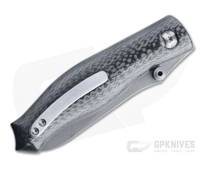Handle: Thick polished titanium liners support fully contoured and polished carbon fiber scales in a sweeping design that is ergonomic and aesthetically attractive. A double palm swell makes the handle secure in multiple grips without the need for aggressive texture or jimping. A custom pivot, titanium Torx screws and half-length Micarta back spacer complete the construction.