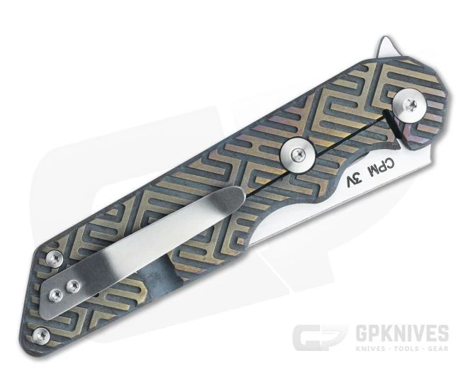 Handle: Built in an open back construction, the handle consists of dual slabs of +4.5 mm thick titanium that are chamfered for a comfortable and milled with “Oriental” pattern texturing and two deep finger grooves for a secure grip. Despite the heft, the knife is fast in the hand and comfortable in multiple grip positions. Both scales have the milled pattern and are outfitted with an anodized finish that is orange peel bronze on the high points and mimic a verdigris patina in the channels. An integral frame lock is smooth and easy to operate and delivers rock solid lockup for safe use. Satin finished hardware rounds out this tank-like build.
