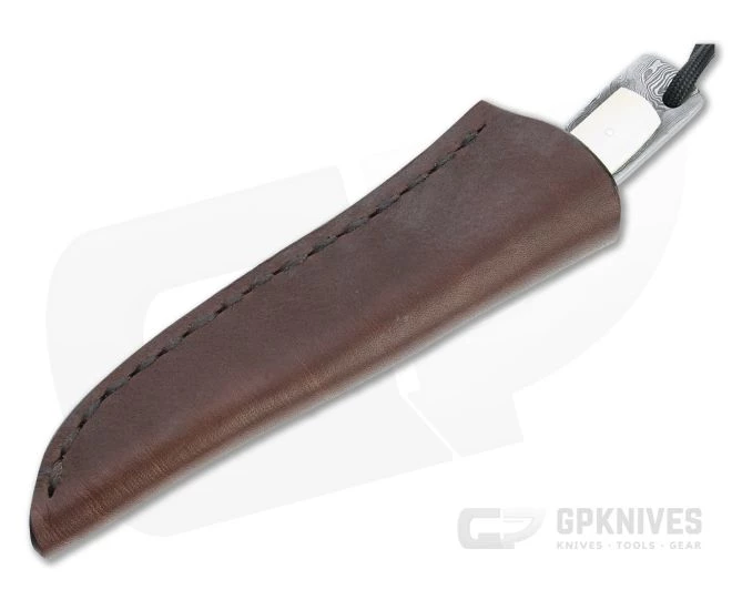 Blade: The compact Damascus drop point blade is hollow ground for powerful slicing with a fine tip and slender profile ideal for detailed tasks. Composed of pattern welded layers of 15n20 and 1080 carbon steel, the blade is tough, easily takes a razor sharp edge, and offers stunning appeal accented with a file worked spine. Clean and oil to prevent corrosion.