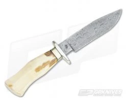 This handsome fixed blade knife was hand made by Bill Miller and the result is an exquisite combination of Fossilized Walrus Ivory and hand forged damascus. Perfectly balanced and super comfortable in the hand, this looker can do the business when called upon. Brand new direct from maker.
