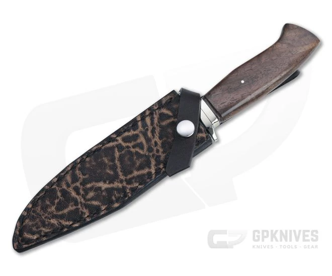 Carries via a hand stitched custom leather and elephant skin sheath with snap closure.