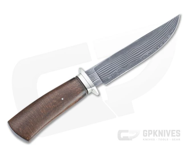 Blade: At over 6.5 inches in length, the +5.5 mm thick Damascus clip point blade is as formidable as it is visually appealing. Composed of pattern welded layers of 15n20 and 1080 carbon steel, the blade is tough and takes a razor sharp edge with ease. The classic Bowie-style clip point is finished with an attractive swedge and hand file work along the thumb rest for added style. Clean and oil to prevent corrosion.