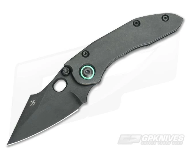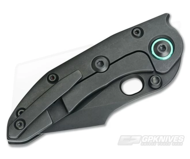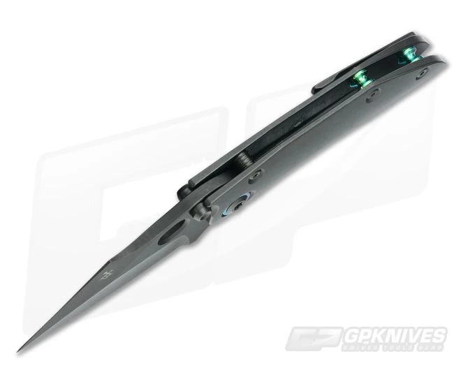 The Handle: Two contoured slabs of titanium feel at home in hand. They have the same black and tumbled finish as the blade with open stand offs construction. The spacers are green anodized to match the pivot collars. Frame lock side has a lock bar stabilizer and sculpted tip up carry Ti pocket clip.