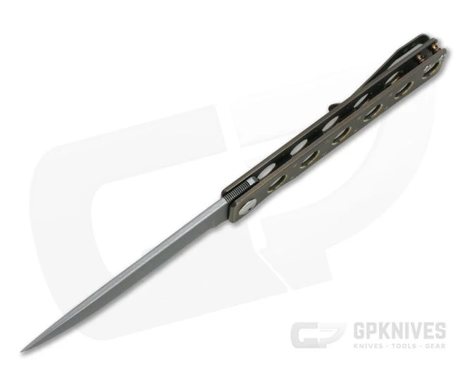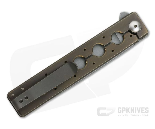 Handle: Two solid titanium slabs form the base of this minimalist yet robust folder with the open back construction achieved with two anodized barrel spacers and the blade pivot. Both slabs are bronze anodized and chamfered for comfort with milled holes for traction and weight reduction. The back slab forms the frame lock mechanism which is reliable and easy to operate with titanium Torx hardware completing this beautiful folder.