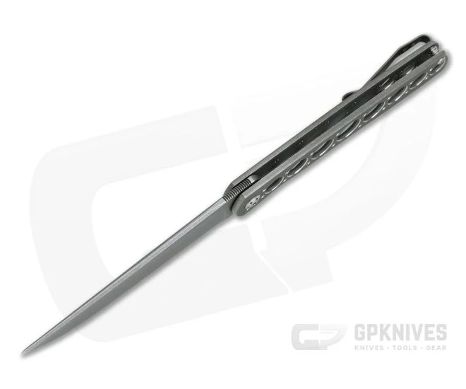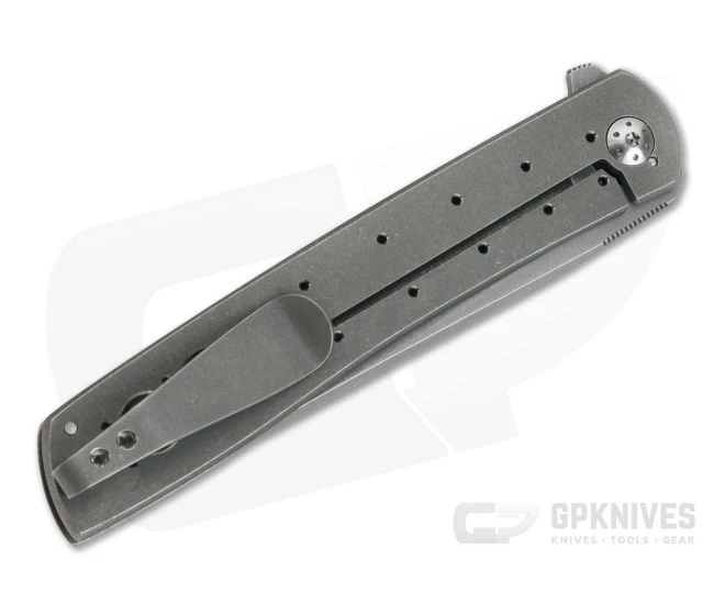 Handle: Two solid titanium slabs form the base of this minimalist yet robust folder with the open back construction achieved with a single titanium barrel spacer and the custom blade pivot. Both slabs have a matching acid stone wash and are chamfered for comfort with milled holes for traction and weight reduction. The back slab forms the frame lock mechanism which is reliable and easy to operate with titanium Torx hardware completing this beautiful folder.