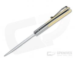 Handle: Tumbled titanium bolsters are dovetailed to vintage linen Micarta scales forming a classically stylish and comfortable handle with over 3.5 inches of grip area. Scales and bolsters are attached via Torx hardware to the engine turned jeweled solid titanium liners in an easy to maintain open construction with a single barrel spacer. A subtle cutout allows access to the jimped titanium liner lock that delivers smooth operation, secure lockup and safe use. Includes padded zipper pouch for storage.
