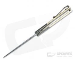 Handle: Tumbled zirconium bolsters are dovetailed to fossilized mammoth ivory scales forming a visually appealing and comfortable handle with plenty of real estate. Scales and bolsters are attached via Torx hardware to the bronze anodized and engine turned jeweled solid titanium liners in an easy to maintain open construction with a single barrel spacer. A subtle cutout allows access to the jimped titanium liner lock that delivers smooth operation, secure lockup and safe use. Includes padded zipper pouch for storage.
