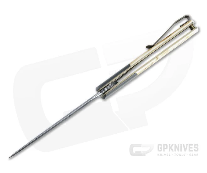 The Custom Brad Zinker Urban Trapper LLF Front Flipper is a blend of his FR Slim and the iconic Trapper pattern with a long, slim profile and ultralight liner lock construction. Made by hand with precision fit and finish and premium materials, this knife is the perfect blend of modern and traditional design. This version comes with a dense twist pattern Damasteel stainless Damascus clip point blade, jeweled bronze titanium liners and mammoth ivory scales with stonewashed zirconium bolsters.