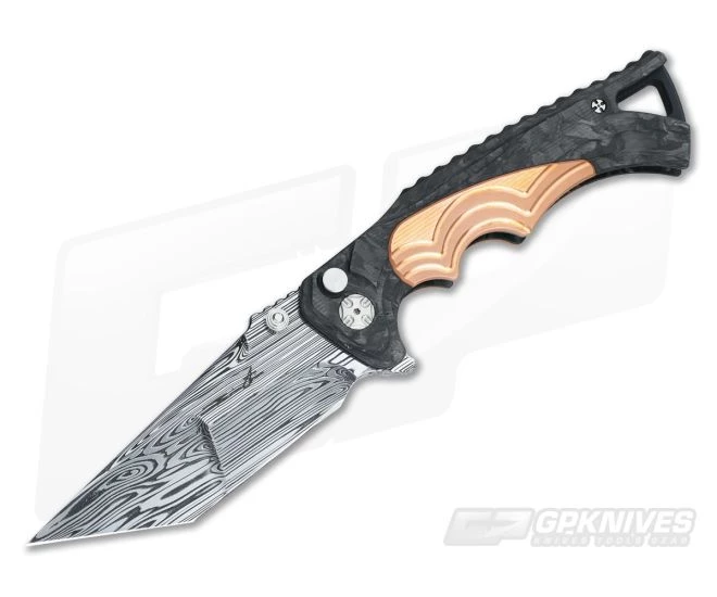 The Handle: Expertly machined carbon fiber handle slabs each measure in at a stocky 0.19″ for a comfortable palm-filling grip. It’s well-balanced with finger grooves that just lock into your hand. Stepped texturing throughout with raw copper inlays on both front and back for an added aesthetic. A ridged black G10 backspacer has a large lanyard window cut out exposed at the bottom taking it up a notch. Near the top a large button lock controls the secured cutting. Custom machined titanium pocket clip with ball bearing retention.