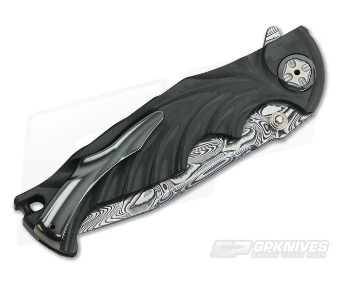 Blade: The Damasteel blade glides on Brian’s STBS (Sealed Thrust Bearings System) for some of the smoothest operation on the planet and deploys via dual thumb studs or the index flipper. A compound ground Spear Point blade provides an excellent combination of strength and cutting performance as well as strong visual lines to complement the overall design of the knife.