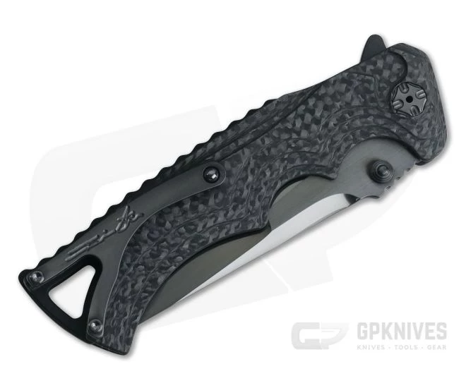 Handle: 3D milled and contoured carbon fiber is used for the entire handle with a black G10 backspacer. The use of a button lock mechanism means that no liners are needed thus reducing the weight considerably. It’s well-balanced with finger grooves that lock the knife into your hand. Stepped texturing throughout enhances the grip. A large window cut out at the bottom of the G10 backspacer allows for lanyard attachment.