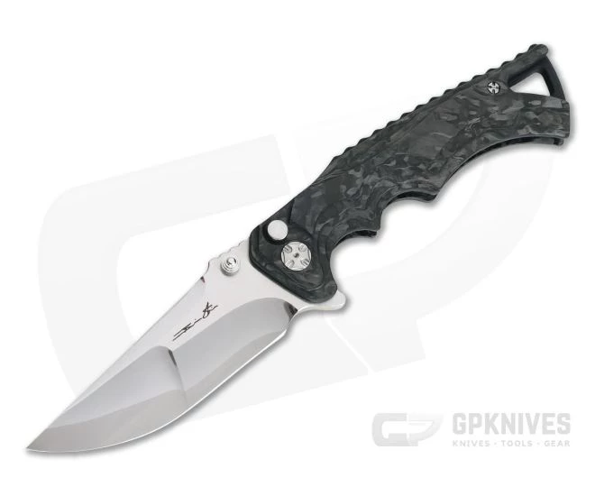 Handle:Â 3D milled and contoured Carbon Fiber is used for the entire handle along with a full length black G10 back spacer. Stepped texturing provides a contoured feel as well as traction in the hand which pairs with the milled finger grooves, pommel swell and index guard for a solid, secure grip. The use of a button lock mechanism means that no liners are needed reducing the weight considerably while maintaining a balanced feel in the hand. A large cut out at the pommel exposes the back spacer which is milled for lanyard attachment. Includes a custom zippered nylon storage pouch.