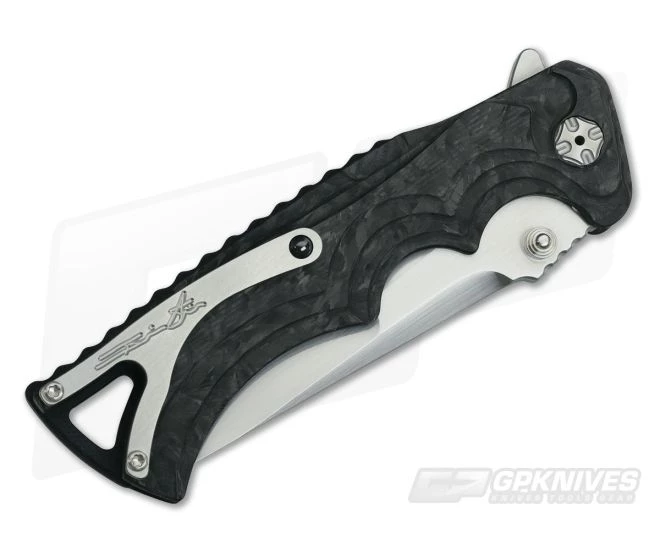 The Handle: 3D machined, marbled carbon fiber is used for the entire handle minus the black G10 backspacer. No liners are needed reducing the weight considerably. The knife is well-balanced with finger grooves that just lock the knife securely into your hand. Stepped milling gives the handles a comfortable, ergonomic feel and visual appeal. A large window cut into the exposed backspacer allow for lanyard attachment while the button lock mechanism deliver secure, reliable operation.