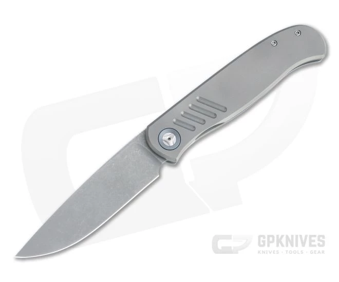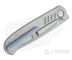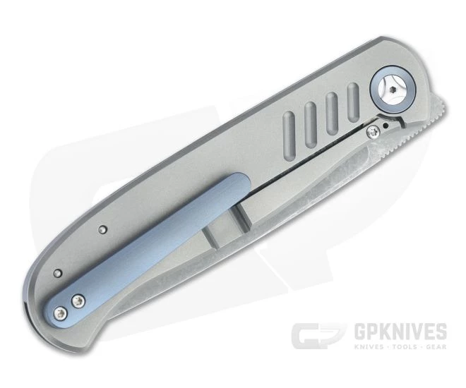 Handle: Blasted matte gray, the streamlined titanium handle is chamfered for a comfortable, secure grip that is easy to carry. Blue anodized pivot collars, back spacer and pocket clip offer a subtle color contrast while milled grooves enhance traction. The robust integral titanium Slab Frame Lock is equipped with a hardened steel lock face insert for smooth operation, rock solid lockup and secure operation for the life of the knife. Ships in a zippered nylon pouch with Certificate of Authenticity.
