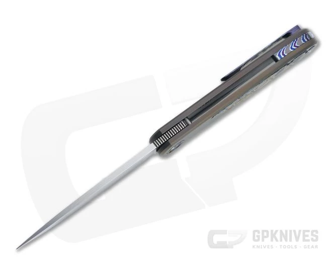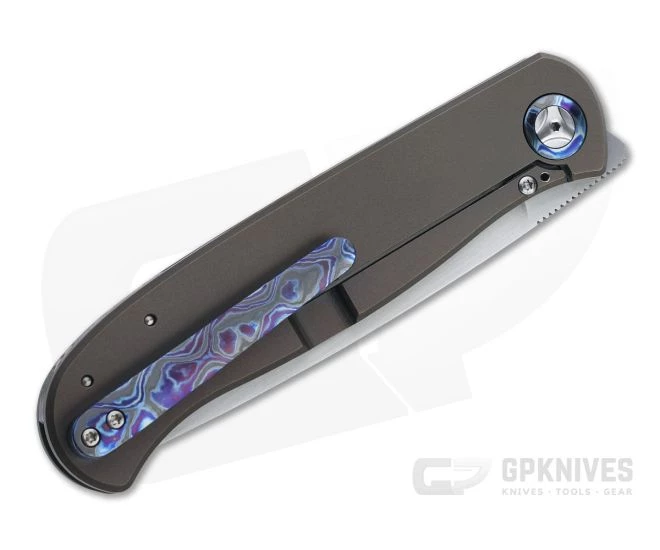 Handle: Matte blasted and anodized bronze, the streamlined titanium handle is chamfered for a comfortable, secure grip that is easy to carry. Black TiMascus pivot collars, back spacer, pocket clip and handle inlay offer a stunning upgrade for eye-catching style. The robust integral titanium Slab Frame Lock is equipped with a hardened steel lock face insert for smooth operation, rock solid lockup and secure operation for the life of the knife. Ships in a zippered nylon pouch with Certificate of Authenticity.