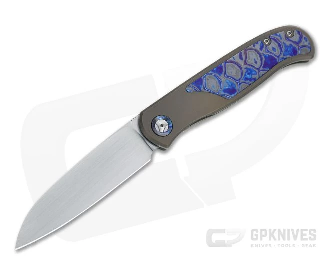 Handle: Matte blasted and anodized bronze, the streamlined titanium handle is chamfered for a comfortable, secure grip that is easy to carry. Black TiMascus pivot collars, back spacer, pocket clip and handle inlay offer a stunning upgrade for eye-catching style. The robust integral titanium Slab Frame Lock is equipped with a hardened steel lock face insert for smooth operation, rock solid lockup and secure operation for the life of the knife. Ships in a zippered nylon pouch with Certificate of Authenticity.