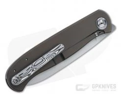 Handle: Matte blasted and anodized bronze, the streamlined titanium handle is chamfered for a comfortable, secure grip that is easy to carry. Damasteel pivot collars, back spacer, pocket clip and handle inlay offer a stunning upgrade for eye-catching style. The robust integral titanium Slab Frame Lock is equipped with a hardened steel lock face insert for smooth operation, rock solid lockup and secure operation for the life of the knife. Ships in a zippered nylon pouch with Certificate of Authenticity.