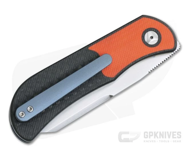 Handle:Â Blue anodized, dual titanium liner construction supports LVA Carbon Fiber Scales with matching back spacer and Hunter Orange G10 inlaid bolsters. A micro-texture milling on the handles increases the traction in hand for added security during use. One liner forms the simple, robust liner lock mechanism delivering secure use and ease of operation.
