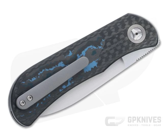 Handle: Thick titanium liners support the solid, lightweight Low Void Aerospace (LVA) carbon fiber scales. Smooth carbon fiber has a stylish look for dress carry elevated by the striking Arctic Storm Fatcarbon inlays, custom pivot and pivot collars. One liner forms the simple liner lock mechanism with silky ceramic detent, delivering smooth operation and solid lockup for safe use. Includes nylon zip pouch and Certificate of Origin.