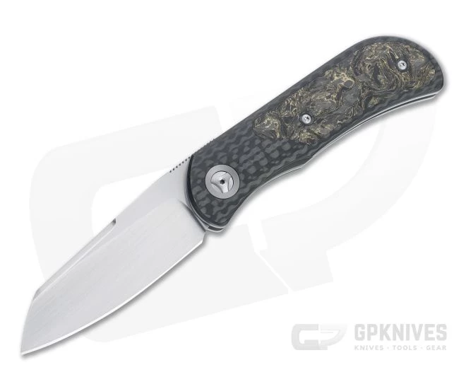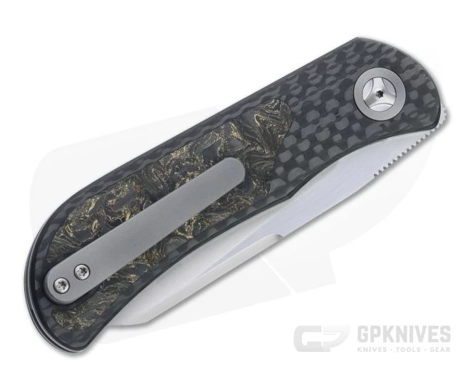 Handle:Â Thick titanium liners support the solid, lightweight Low Void Aerospace (LVA) carbon fiber scales. Smooth carbon fiber has a stylish look for dress carry elevated by the striking Dark Matter Gold Fatcarbon inlays, custom pivot and pivot collars. One liner forms the simple liner lock mechanism with silky ceramic detent, delivering smooth operation and solid lockup for safe use. Includes nylon zip pouch and Certificate of Origin.