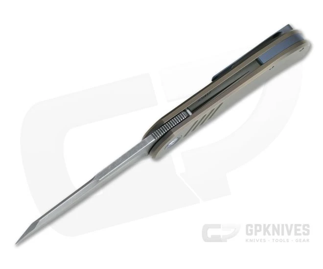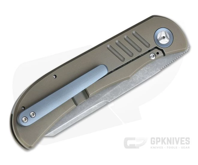 Handle: The rugged integral titanium Slab Frame Lock is equipped with a hardened steel lock face insert for smooth operation, rock solid lockup and secure operation for the life of the knife. Blue anodized pivot collars, floating back spacer and pocket clip add a touch of color giving it a classy look. The handle slabs are lightly contoured and are bead blasted for a matte finish and subtle texture and bronze anodized. Ships in a zippered nylon pouch with Certificate of Authenticity.