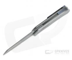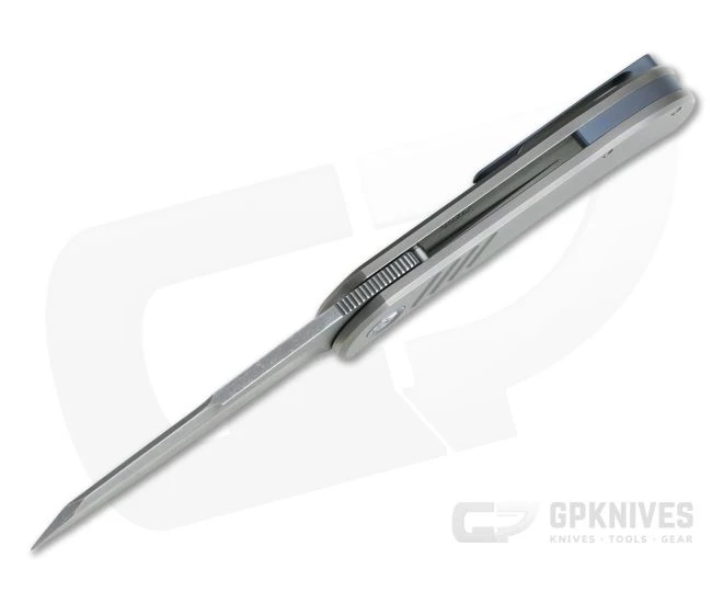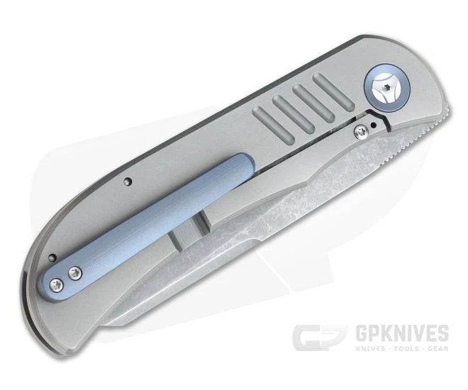 Handle: The rugged integral titanium Slab Frame Lock is equipped with a hardened steel lock face insert for smooth operation, rock solid lockup and secure operation for the life of the knife. Blue anodized pivot collars, floating back spacer and pocket clip add a touch of color giving it a classy look. The handle slabs are lightly contoured and are bead blasted for a matte gray finish and subtle texture. Ships in a zippered nylon pouch with Certificate of Authenticity.