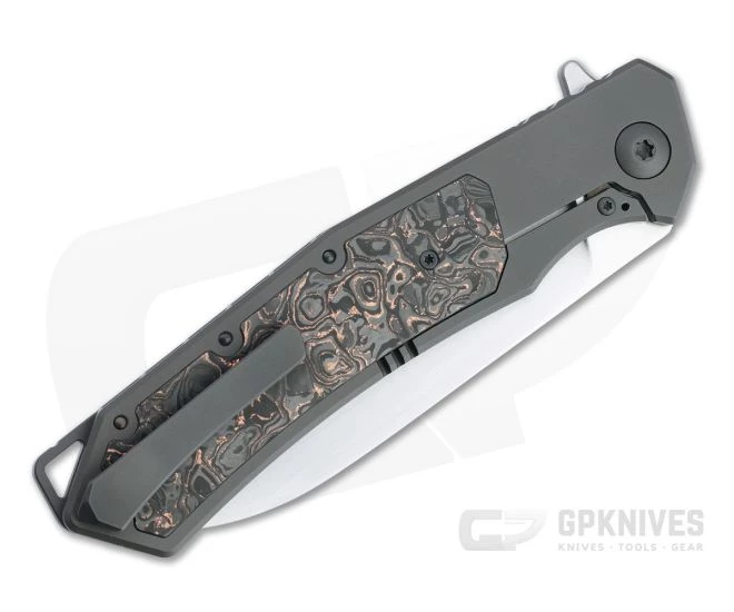 Handle: Blasted matte dark gray titanium slabs are internally milled for weight reduction forming a slim yet substantial handle. The ergonomic design is enhanced by chamfered edges for comfort with a deep index choil and jimping near the pivot. The integral frame lock comes with a hardened steel lock face for smooth operation, solid lockup and secure operation for the life of the knife. Custom copper Carbon Plate carbon fiber inlays are stunning and further reduce the carry weight. Ships in a zippered nylon pouch with Certificate of Authenticity.