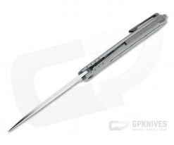 Handle: Blasted matte gray titanium slabs are internally milled for weight reduction forming a slim yet substantial handle. The ergonomic design is enhanced by chamfered edges for comfort with a deep index choil and jimping near the pivot. The integral frame lock comes with a hardened steel lock face for smooth operation, solid lockup and secure operation for the life of the knife. Custom copper “Dark Matter” Fat Carbon inlays are stunning and further reduce the carry weight. Ships in a zippered nylon pouch with Certificate of Authenticity.
