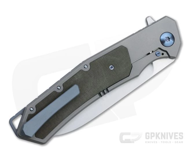 Built with precision by South African custom knife maker Trevor Burger, the TBC Sierra is a large, sleek, titanium frame lock flipper with tactical influence and dress carry style. Features include custom Ti Connector hardware, double row ceramic bearing pivot with ceramic detent, and full titanium spacer and clip. This version comes with a hand rubbed Elmax blade, GR5 titanium handle, blue hardware and OD Green linen Micarta inlays.