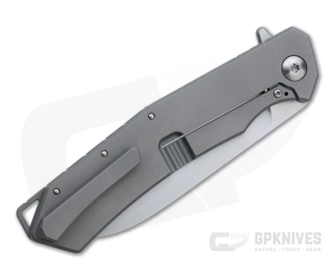 Handle: Blasted matte gray titanium slabs are internally milled for weight reduction forming a slim yet substantial handle. The ergonomic design is enhanced by chamfered edges for comfort with a deep index choil and jimping near the pivot. The integral frame lock comes with a hardened steel lock face for smooth operation, solid lockup and secure operation for the life of the knife. Custom satin hardware complements with blade. Ships in a zippered nylon pouch with Certificate of Authenticity.