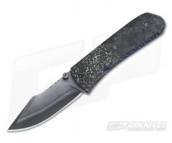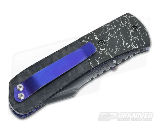 The Handle: Stocky for it’s small stature, the 1/2 inch thick handle features intricately file worked and purple anodized liners with marble carbon fiber scales and mosaic space junk damascus bolsters. Torx screw construction with matching purple anodized titanium poicket clip for tip-up right-hand carry.