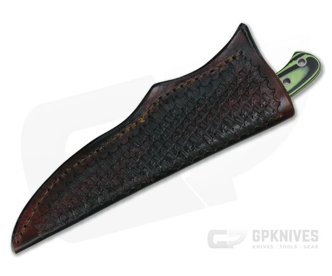 Sheath: Carries via a hand tooled, stitched leather belt sheath.
