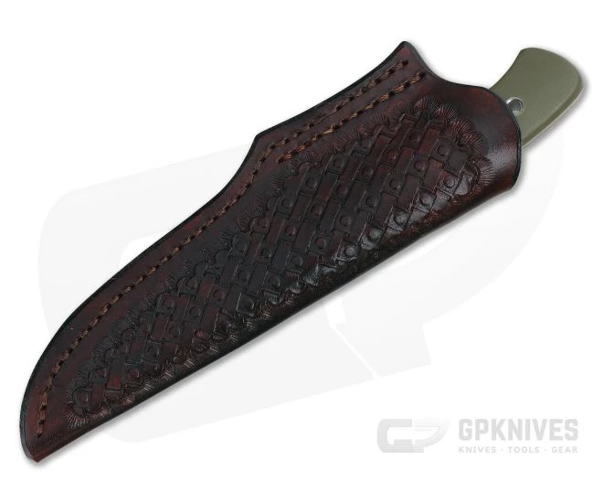 Sheath: Carries via a hand tooled, stitched leather belt sheath.