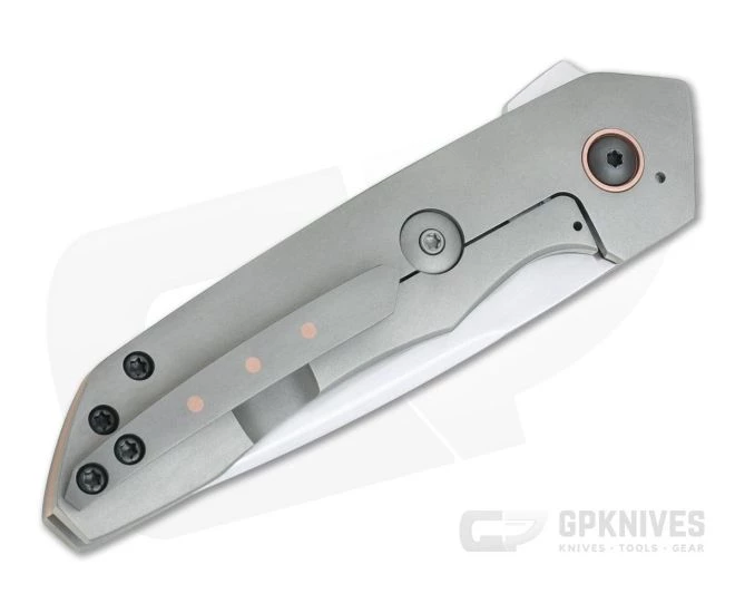Handle: The simple, spartan handle is ergonomically designed and contoured for comfort in the hand with a fine, matte gray blasted finish. A few subtle adornments are offered for style: Copper pivot collar and a milled groove with copper dot inlays which also allows for indexing in the hand and added traction. The integral titanium frame lock is rock solid and smooth to operate with a matching lock bar stabilizer/over travel stop. Construction is completed with black Torx hardware and a solid copper back spacer.