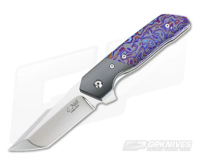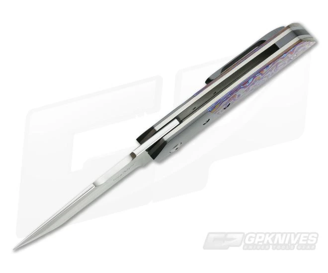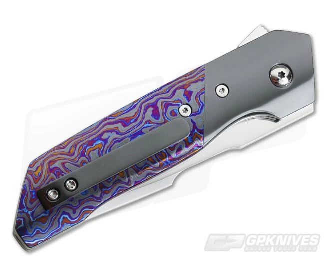 The Handle: Liners built with wonderful matte grey titanium gets a light sheer to it via the orange peel method. This finishing adds a most welcomed texturing and appearance throughout. Dark and mysterious Zirconium bolsters accent the insane star of the show…Lava Lamp Black TiMascus scales. They have a bolster-matching background with wildly blue and purple lava flow. The Hardline features polished Torx hardware, Zirconium back spacer and tip up pocket clip.