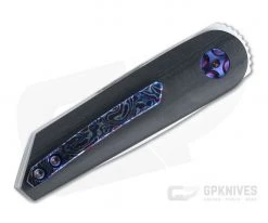 The Midge from custom knife maker Chad Nell is a simple, (double)detent slip joint top flipper that offers sleek style and excellent performance in a compact, non-locking folder. The epitome of a gentleman’s carry folder this knife is packed with custom details and while offering a highly functional EDC cutting tool. This piece has a hand rubbed satin, AEB-L spear blade, jeweled titanium liners, vintage black linen Micarta handle scales, custom anodized titanium hardware, abalone inlaid front pivot with polished collar and Lava Lamp Timascus clip.